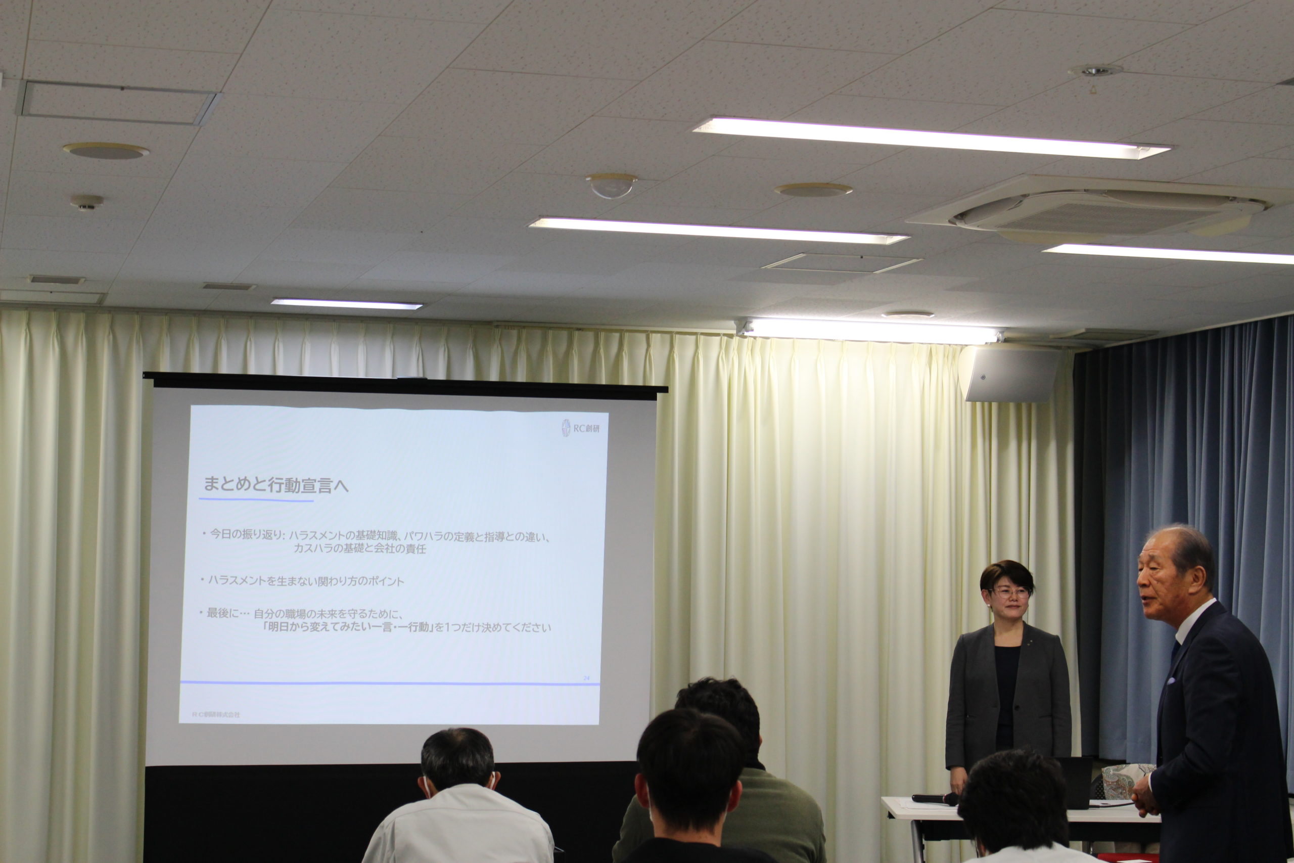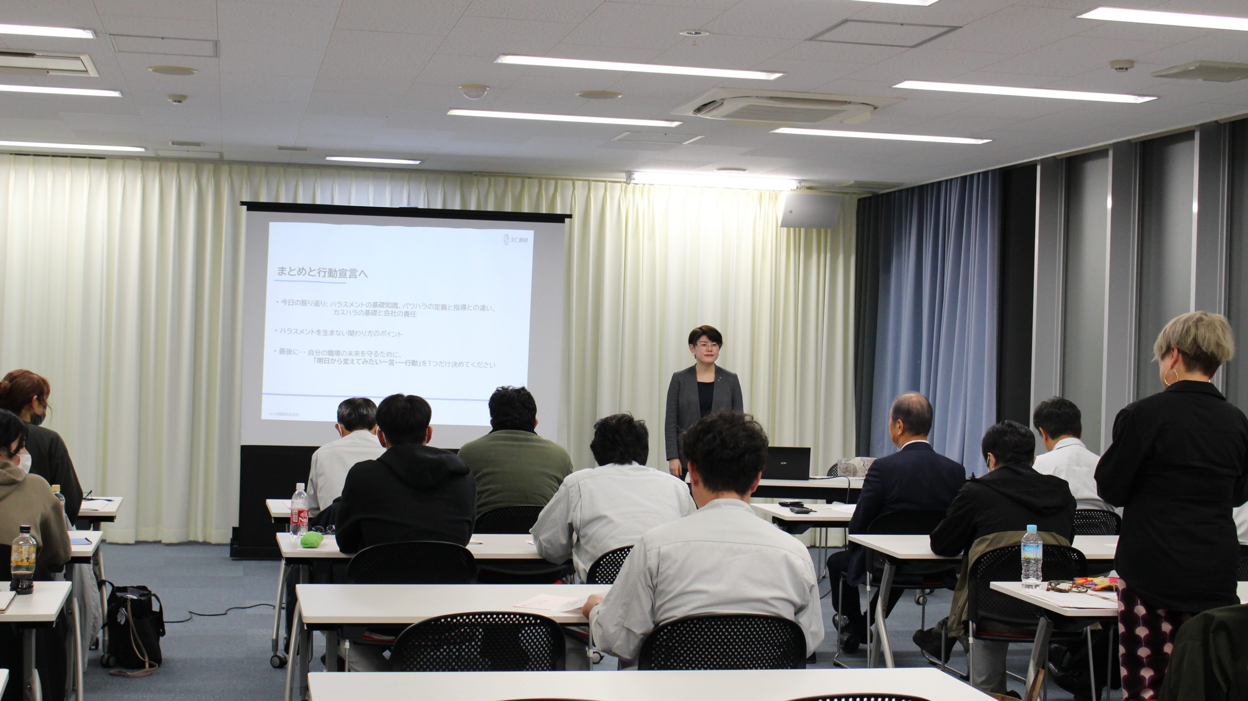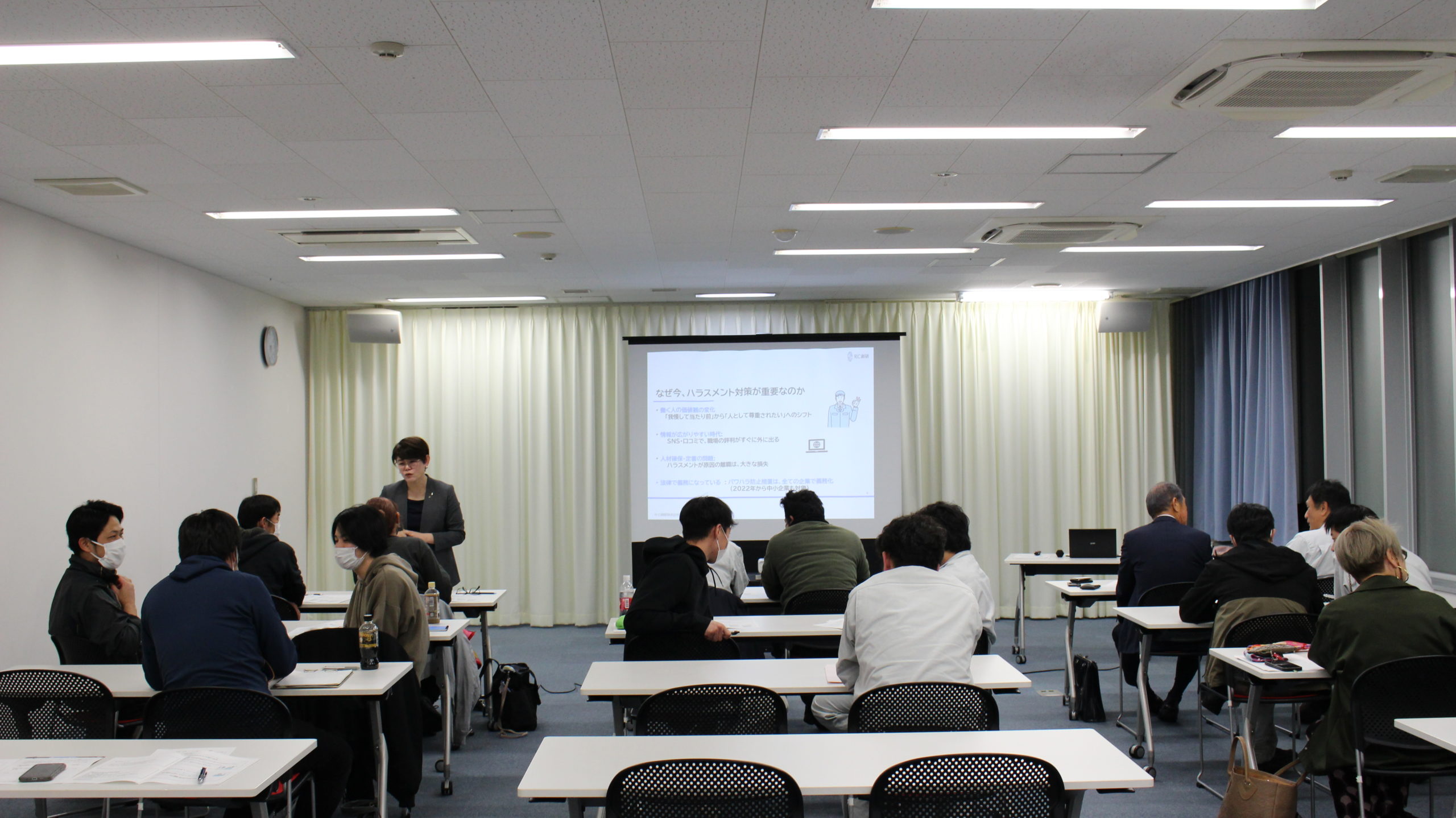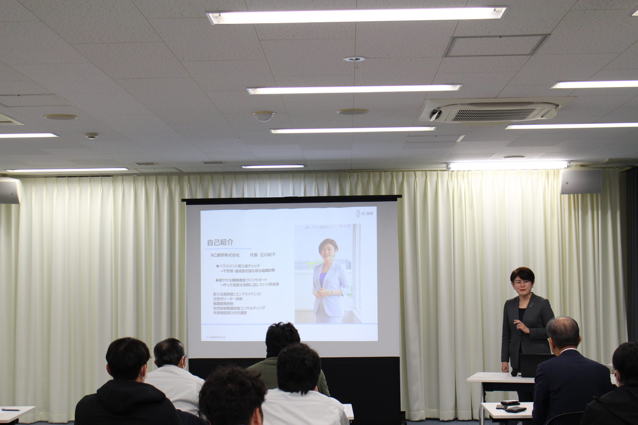 初回の25日は、開講にあたり近藤昌泰蒲郡鉄工会会長(製造部会部会長)の挨拶後、講師のRC創研㈱代表取締役 江川 紀子 氏による『うちは大丈夫!が一番危ない 未来を守り創るハラスメント研修』をテーマに講義が行なわれました。