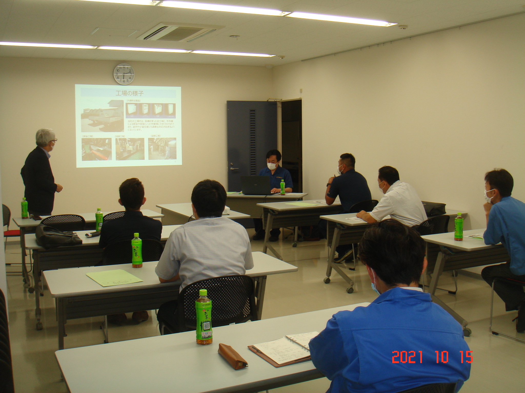 神谷塾長の支援内容の報告に続き、今回の支援事業所の㈱晃伸電機工業は、主に各種制御用ボックス・配電盤などの板金・塗装一貫製作を、単品から量産まで幅広く手掛けているメーカーです。酒井伸豪取締役からは、支援テーマのITを活用した『動画による作業要領作り』について、いかに外国人研修生へ仕事内容を分かり易く伝えるかなどの作業説明の発表がありました。