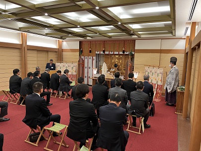 当日の参加者は来賓を含め30名で、節分会の神事は、2階の「高砂」で大宮神社の榎本宮司様により厳かに執り行われました。