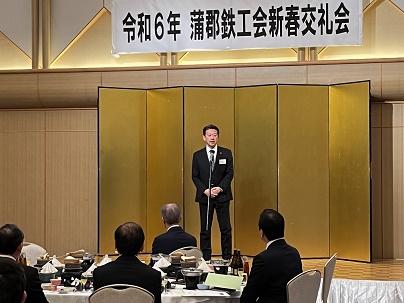 その後の新春交礼会は、「コンベンション海皇」に移動し、この度の能登半島地震で犠牲となりました方々にお悔やみの「黙とう」を行った後、主催者を代表して近藤昌泰蒲郡鉄工会長(蒲郡商工会議所金属鉄工部会会長)の挨拶があり、続いて来賓を代表して鈴木蒲郡市長、喚田愛知県議会議員の挨拶がありました。なお、今枝衆議院議員は、この度の文部科学副大臣に就任したこともあり、公務を終えて東京から少し遅れて会場に駆けつけていただき挨拶をいただきました。