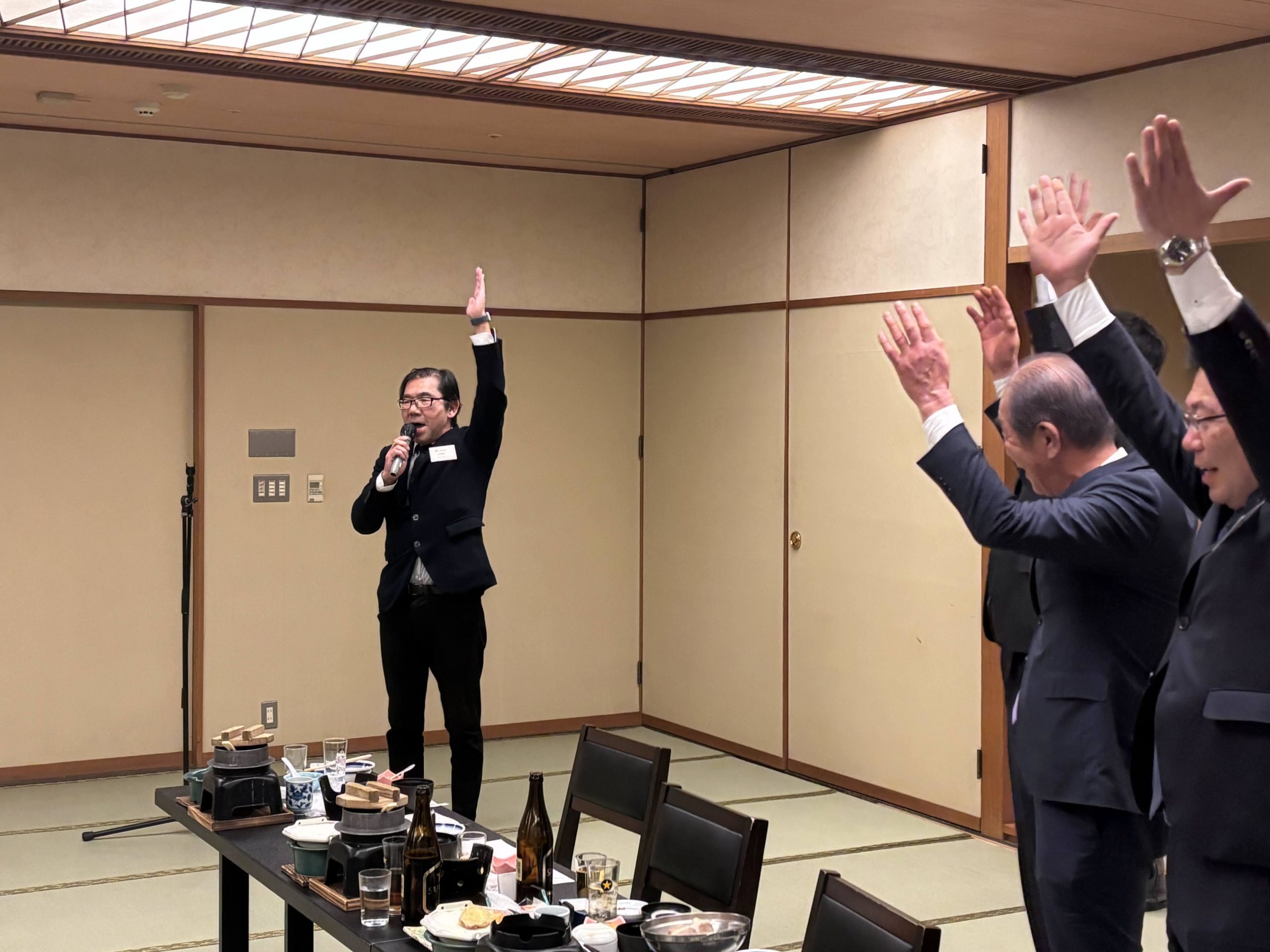 乾杯のご発声は、蒲郡信用金庫の岡本理事長により執り行われて、続いて行われた恒例の「豆まき」は、来賓、役員、年男の9名により、商売の繁盛と参加者の皆様の益々のご活躍とご健勝を祈念して声高らかに“鬼は外、福は内”を3度唱和しました。歓談も終始和やかな雰囲気の中で進められ、予定の時間となり、愛知工科大学の石原工学部長の音頭により万歳三唱で締めくられました。