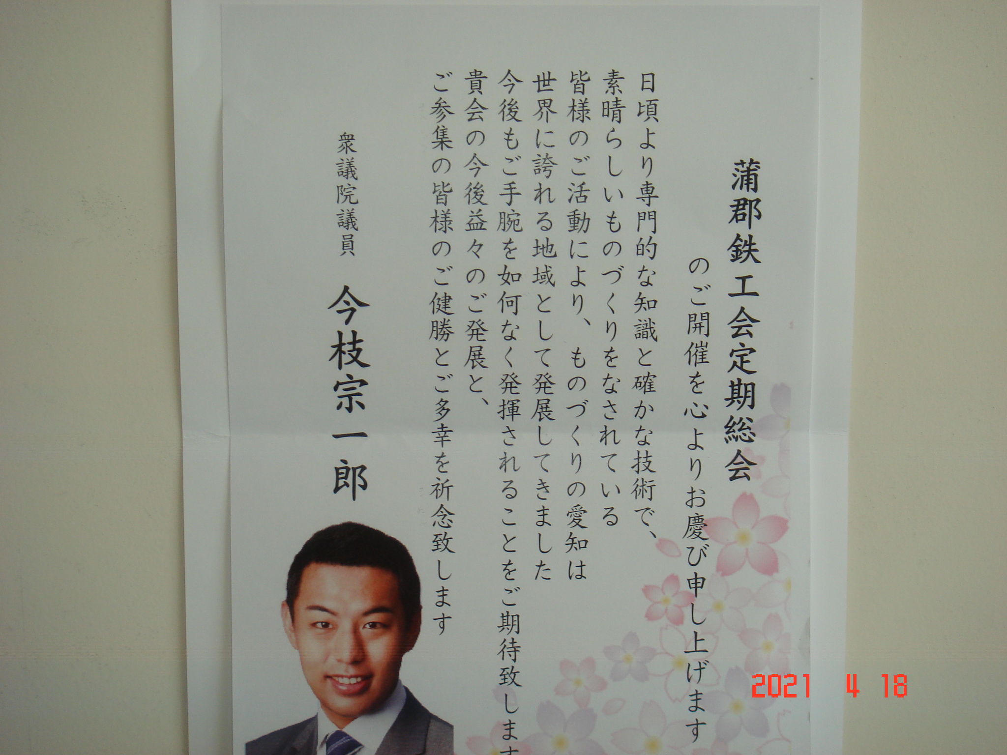 このところの暖かさから少し寒さが戻って来た、4月16日(金)に蒲郡鉄工会の令和3年度定期総会が蒲郡商工会議所で2年ぶりに開催されました。
